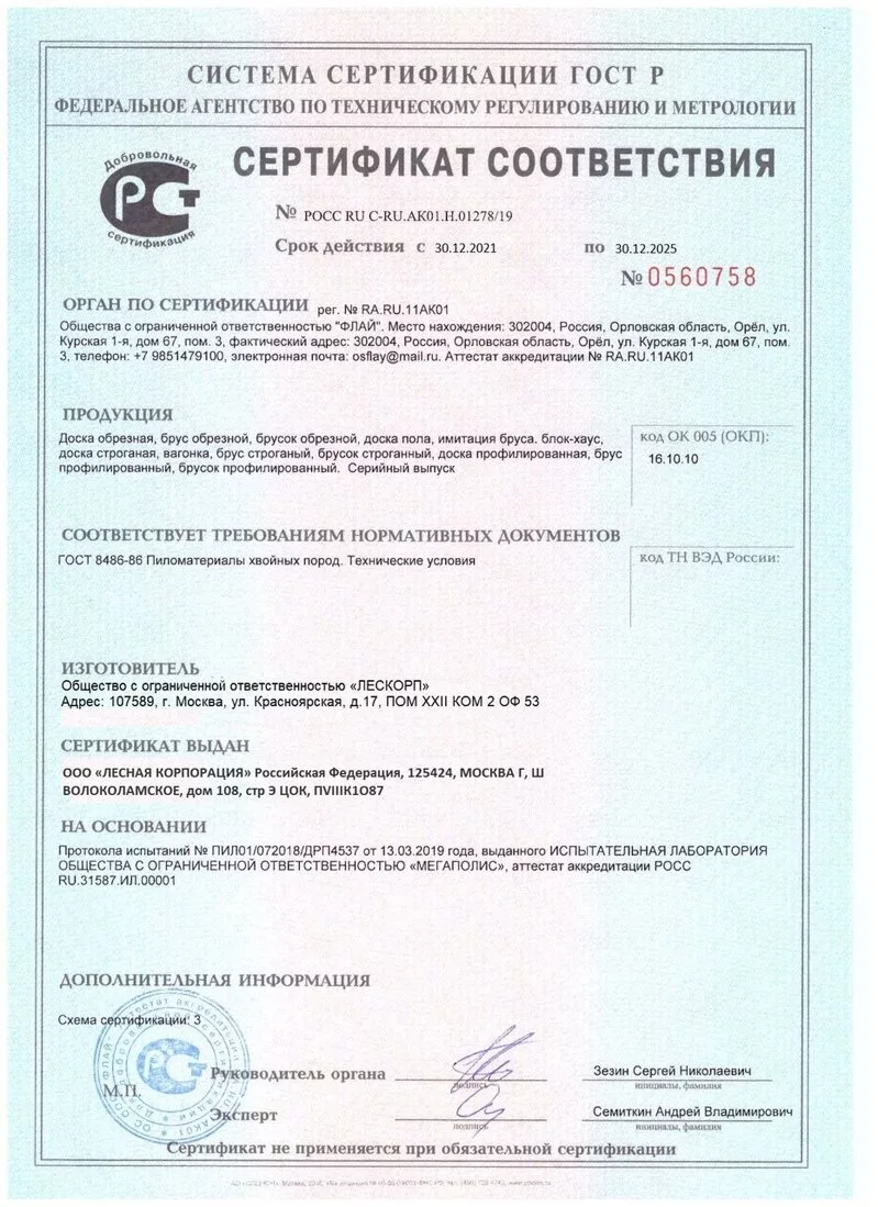 Материал соответствует 1-2 сорту. Возможно наличие некоторого количества обзола, некритичных для структуры древесины трещин и небольших отверстий от выпавших сучков. Влажность древесины менее 18%.